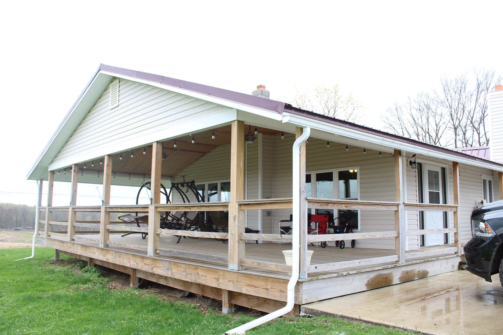 Outside, the property continues to impress with a large partial wrap-around porch/deck equipped with electrical hookups for fans, lighting, and even a TV—perfect for relaxing or entertaining. The attached 1950’s non-insulated 4-bay garage includes two concrete bays with roll-up doors and two stone/dirt bays with sliding doors, offering ample storage and workspace. A main stone driveway and secondary dirt driveway provide easy access, while the elevated setting offers privacy and scenic views. Additional features include wired internet through TDS and a video surveillance system. Please note that propane tanks are not owned by the seller, and there is some water damage present in the breezeway ceiling.