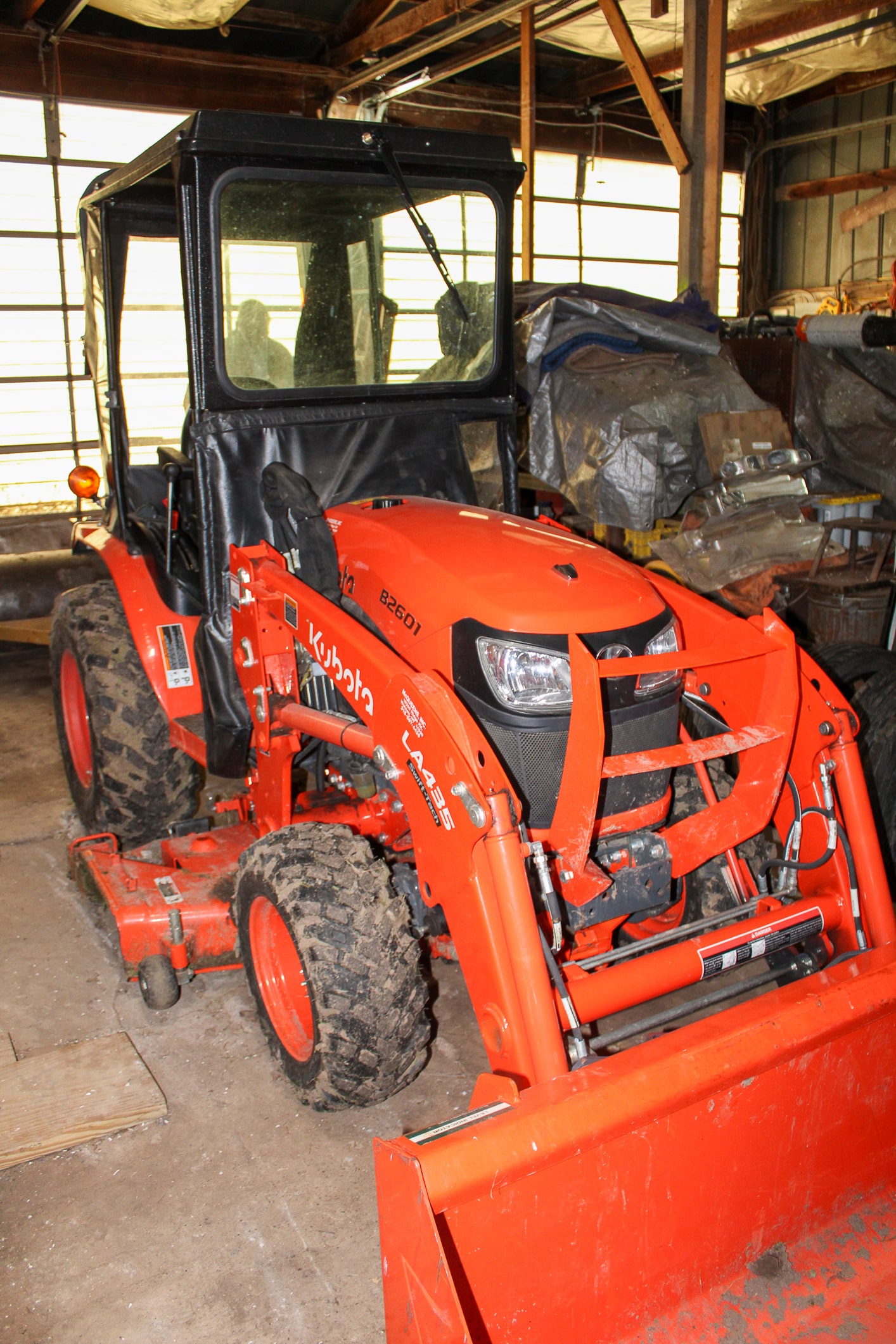 2022 Kubota B2601 compact w/ LA435 loader, 256hrs, hydrostatic, 4wd, soft cab, diesel, 60” mid mount deck, bucket and forks