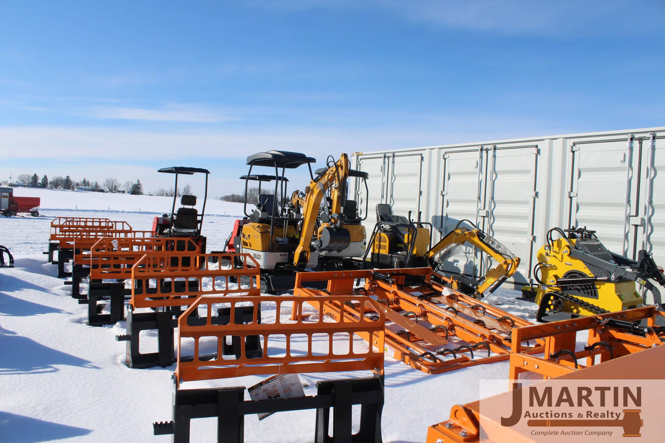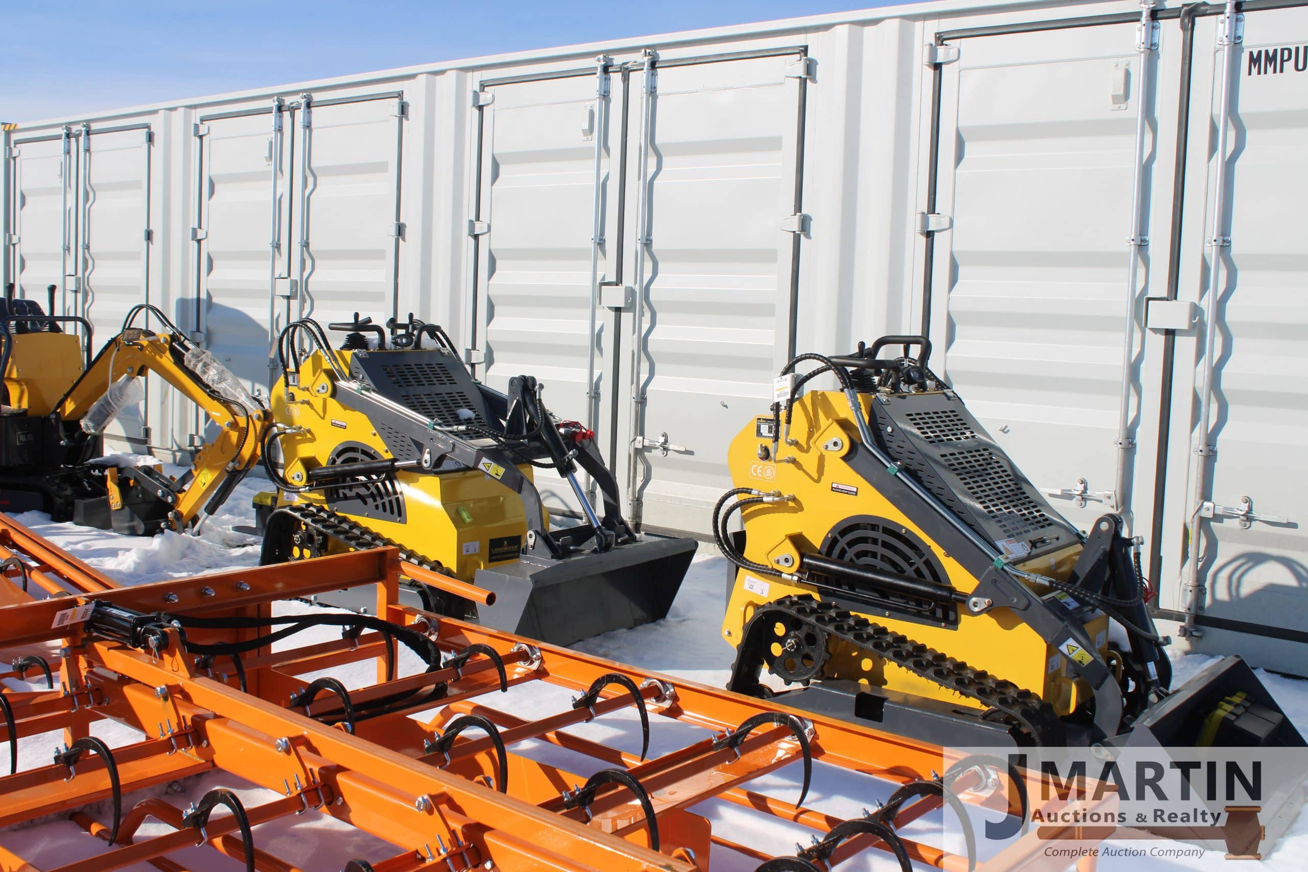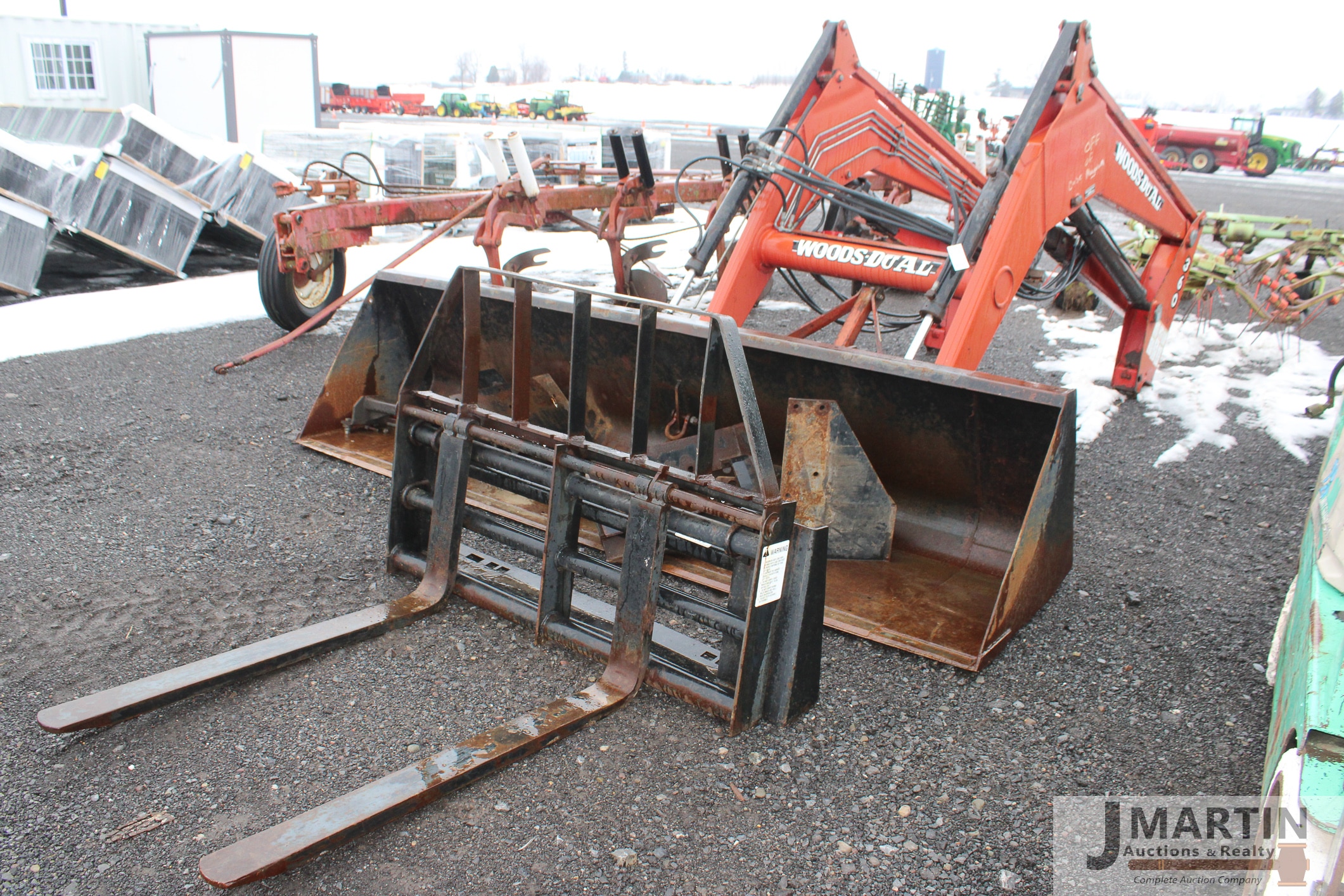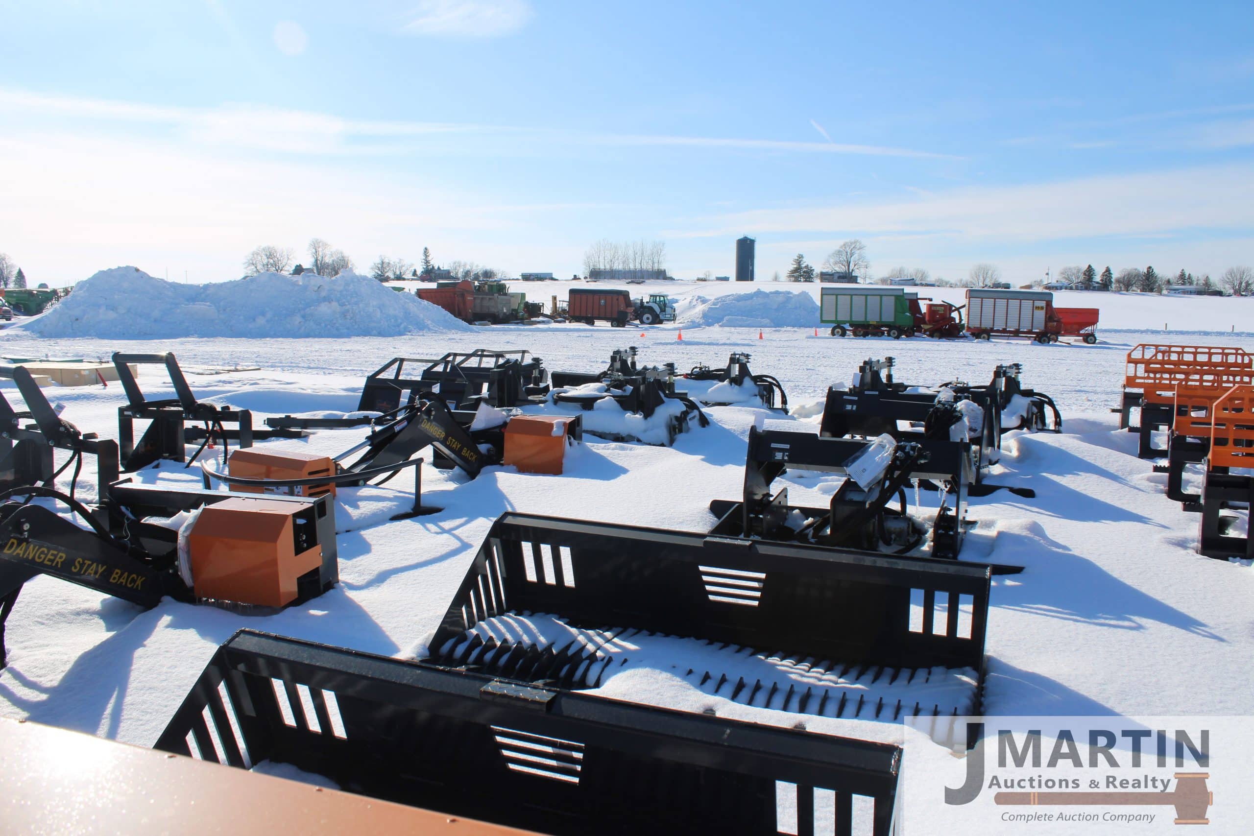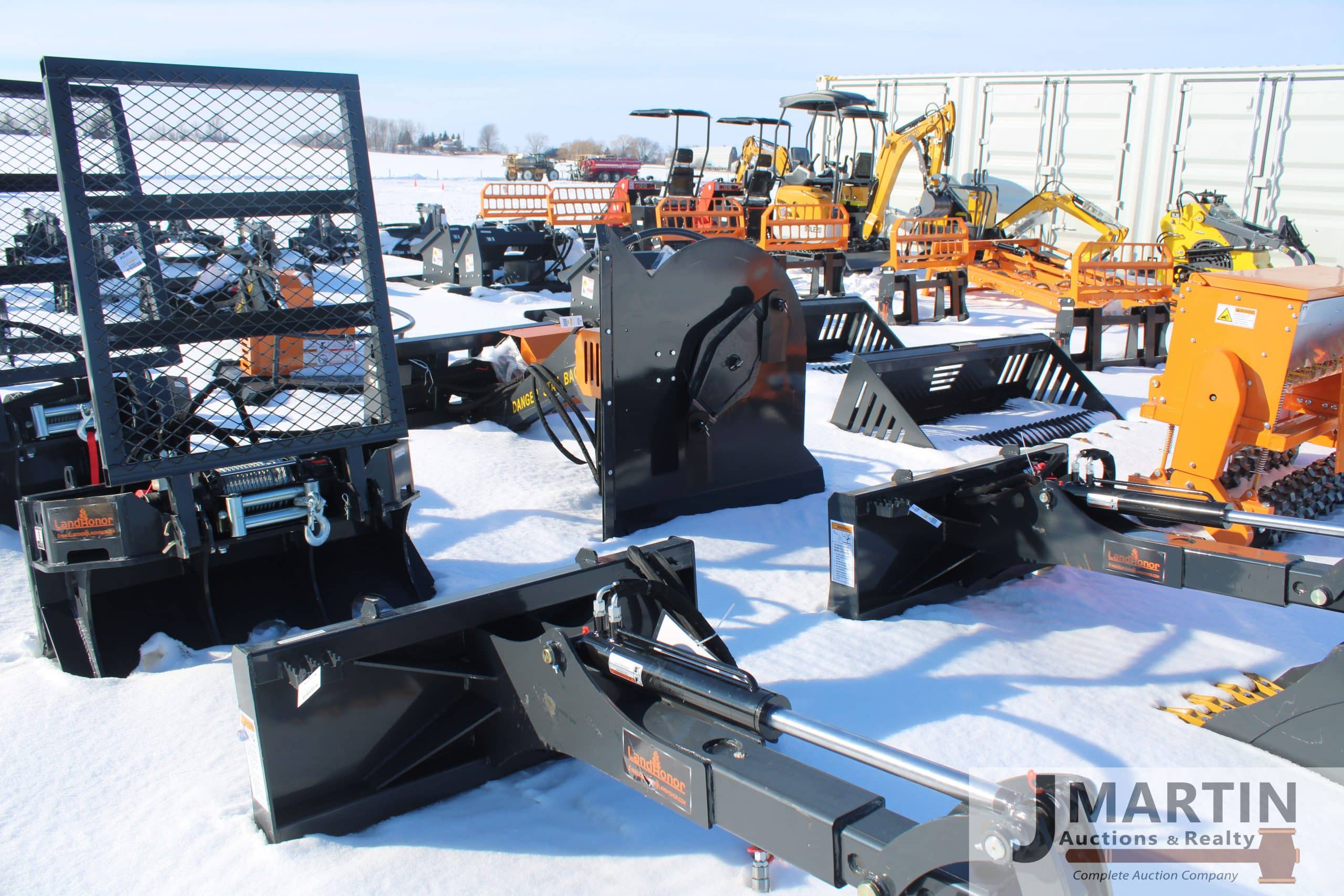 Large amounts of unused skid mount buckets, pallet forks, grapples, mowers, augers, tillers, bale grapples, logging winches, etc