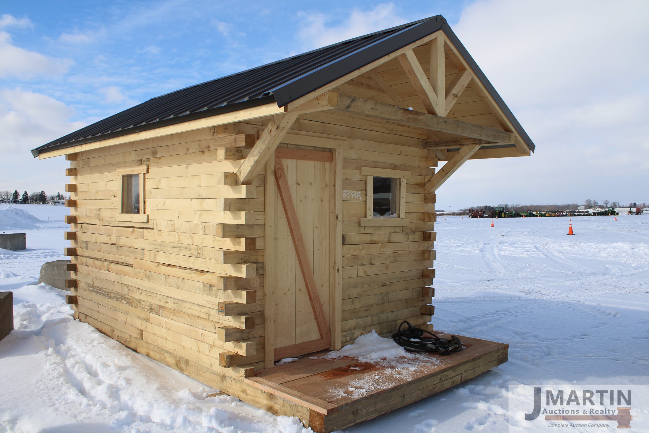 8’x 12′ Log cabin style shed w/ 3′ porch