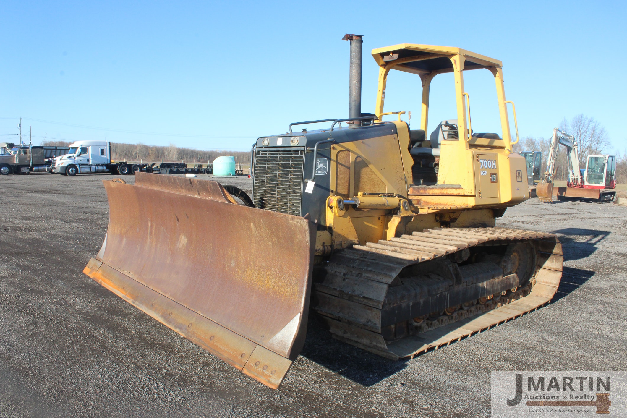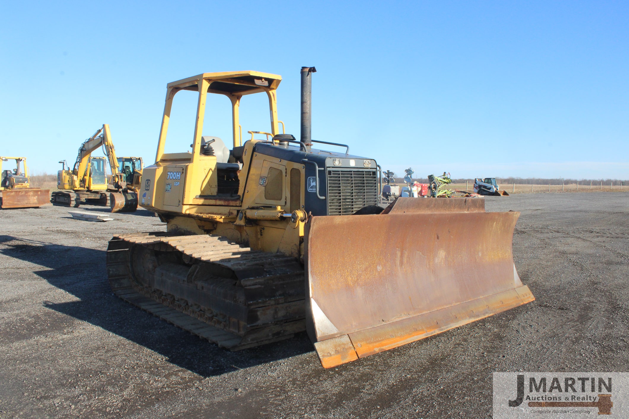2001 JD 700H LGP dozer w/ 11,556hrs, OROPS, JD Powertech 6.8L engine, variable spd drive, joystick controls, 30” track pads, 11′ 6 way straight blade
