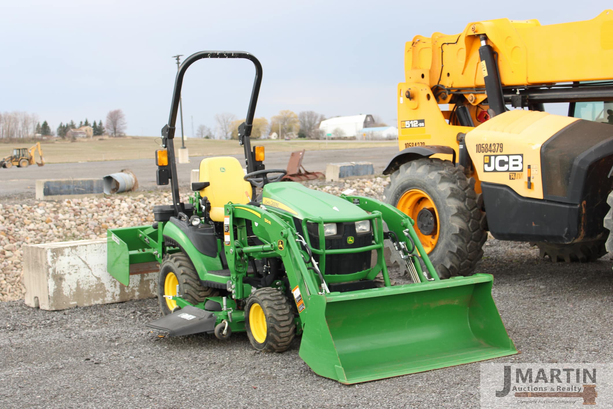 2022 JD 1025R compact w/ JD 120R loader, 39hrs, 2spd hydro, 4wd, 540pto, 3pt w/ quick hitch, 54” bucket, Auto connect 60D 60” mower
