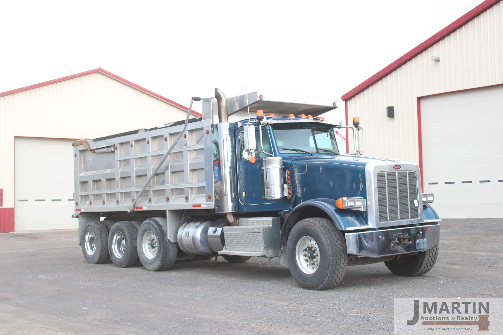2012 Peterbilt 367 dump truck w/ 400,911mi, 15spd manual trans, Paccar 12.9L 6cyl engine, 19′ alum dump, coal chute, front to back roll tarp, triaxle, lift axle, full locking rears, walking beam suspension, 20K# front axle, 86,000#GVWR