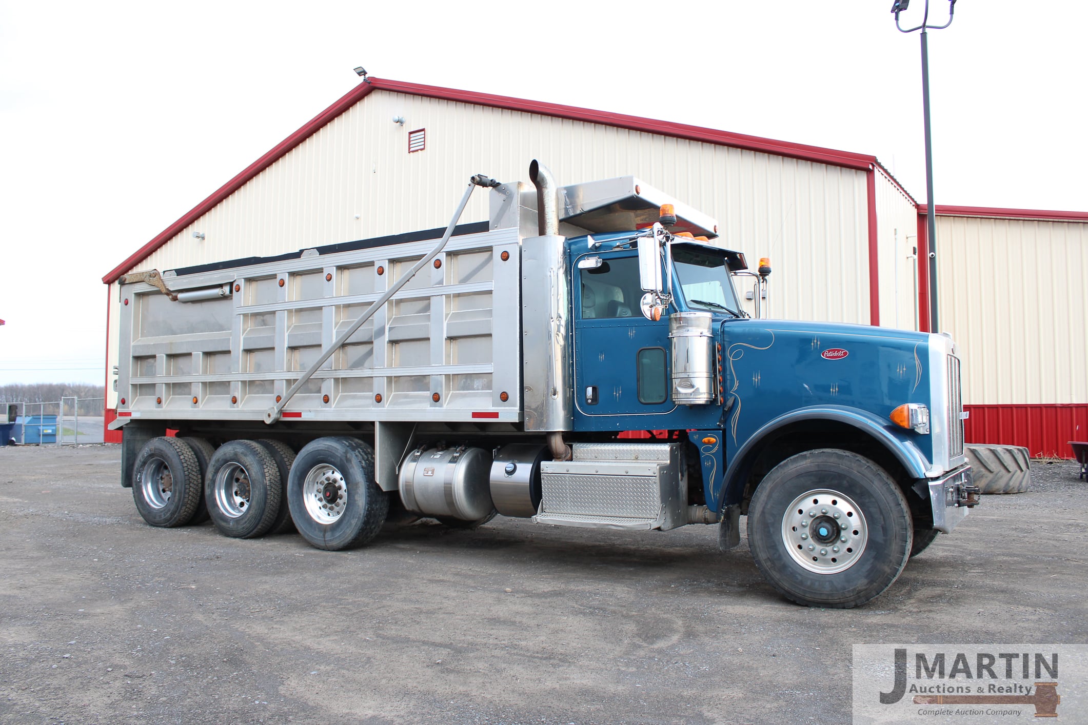 2012 Peterbilt dump truck w/ 315,863mi, 15spd manual trans, Paccar 12.9L 6cyl engine, full locking rears, lift axle, 19′ alum bed, air lift tail gate w/ coal chute, walking beam suspension, 20K#GVWR, front to back tarp, rotary beacons